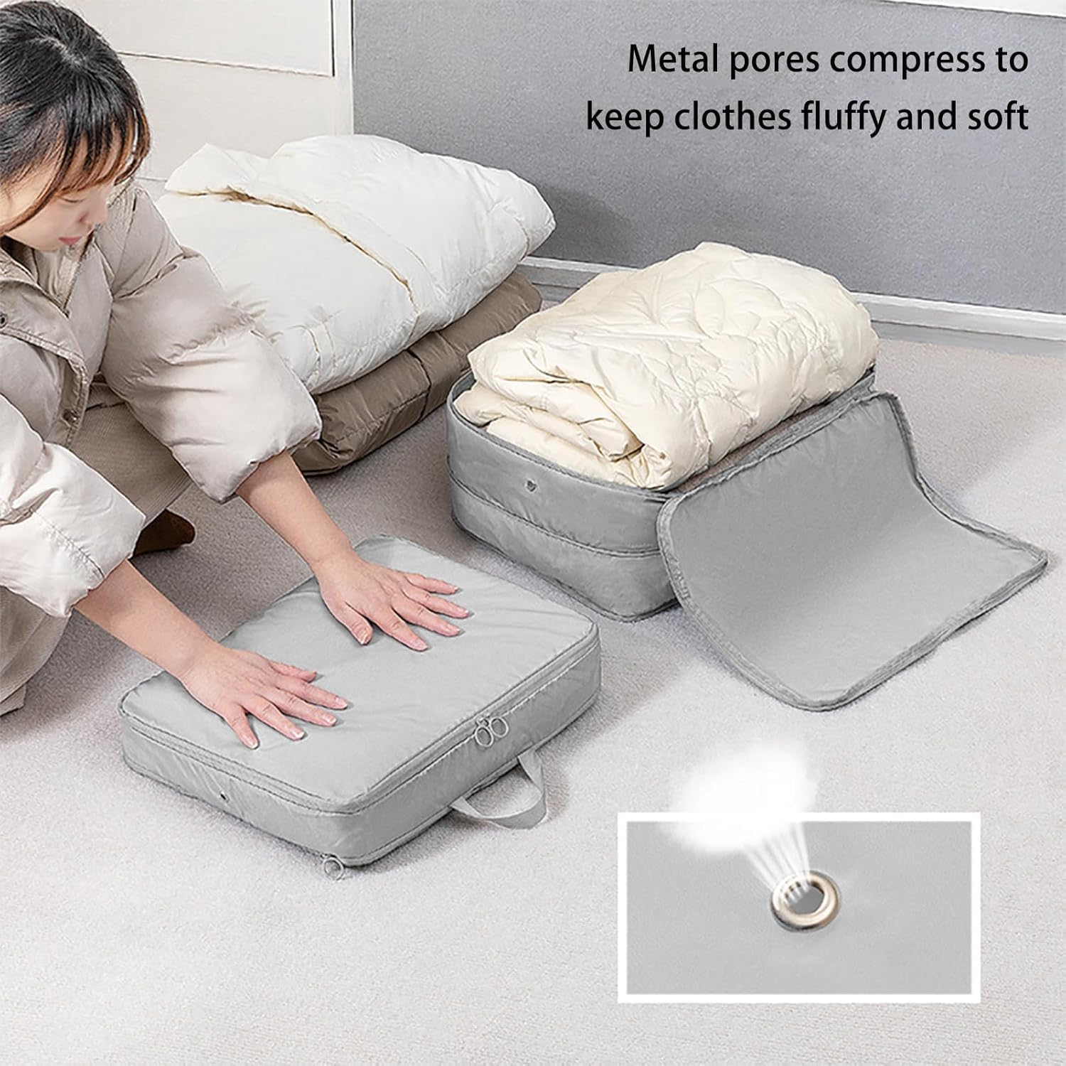 Maximize packing space with this compact self-compression storage bag. Durable, foldable, and perfect for organizing clothes, towels, bedding, and more during travel or home storage.